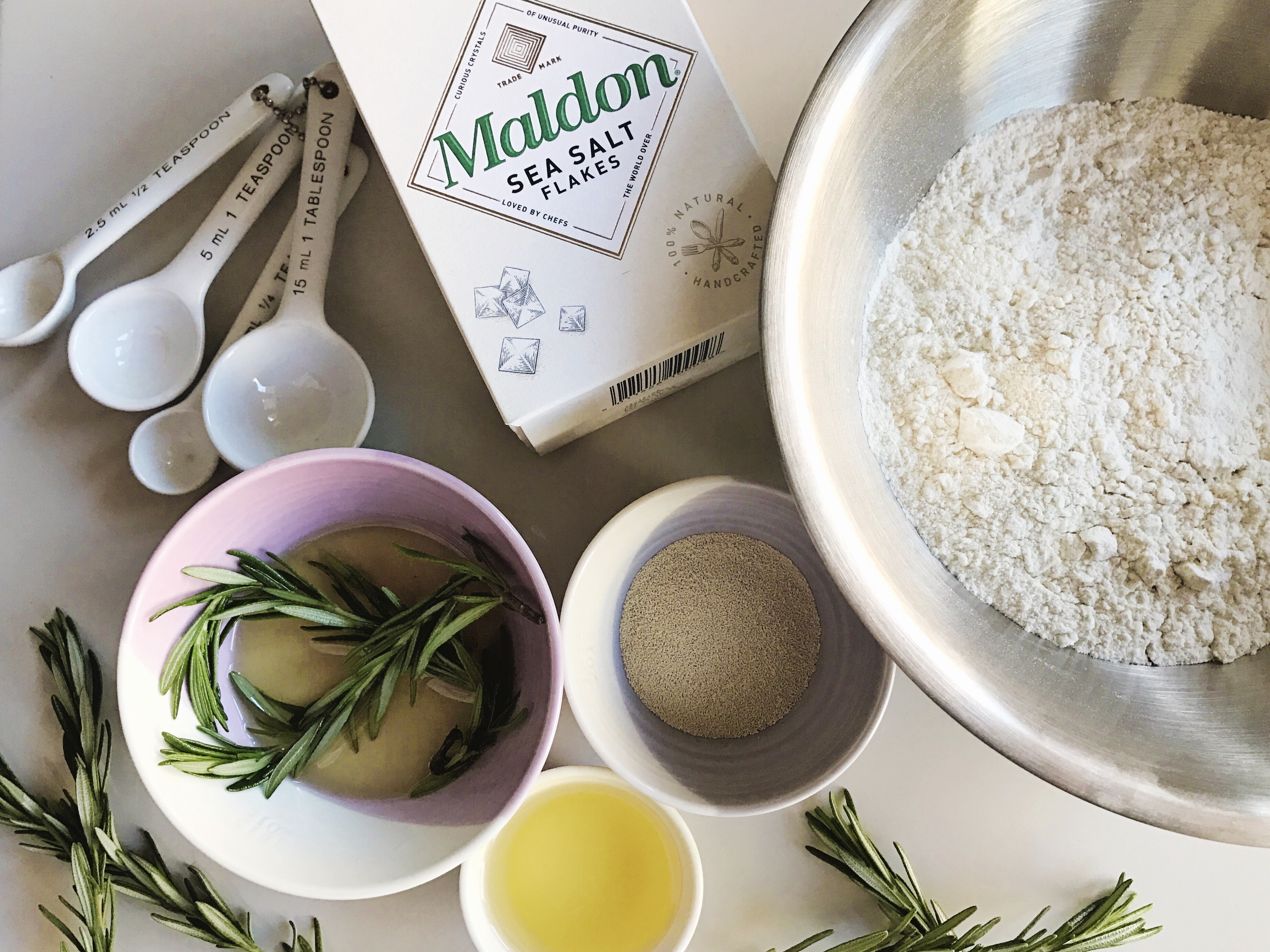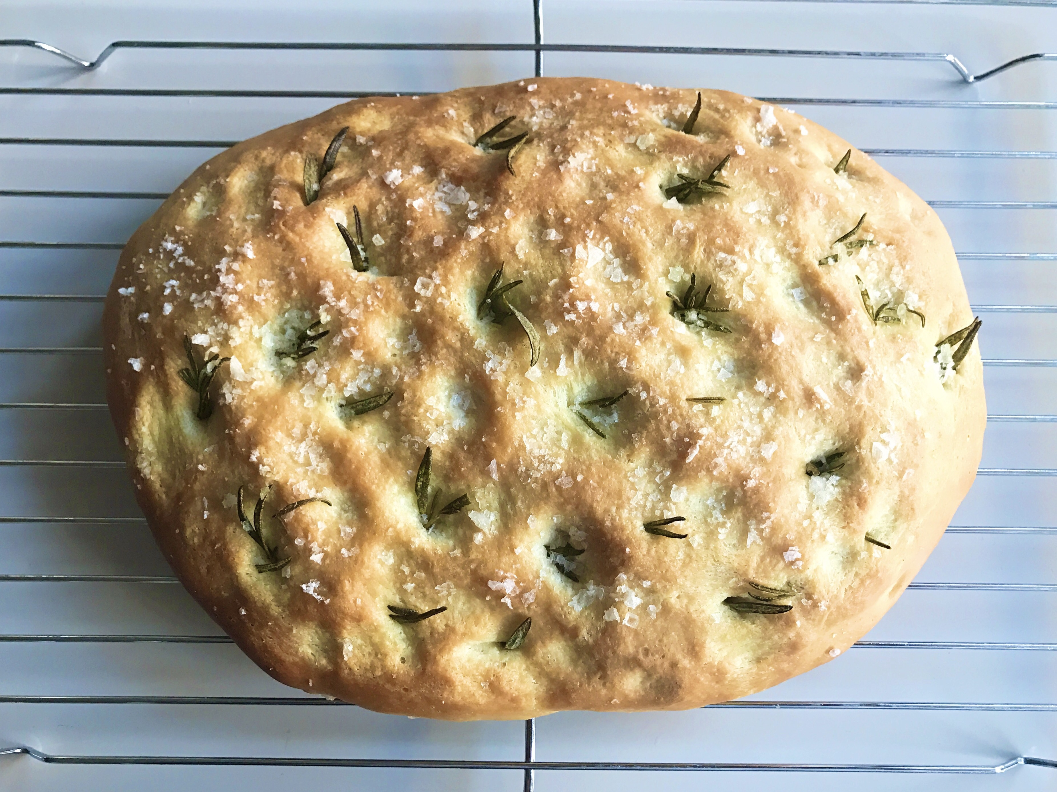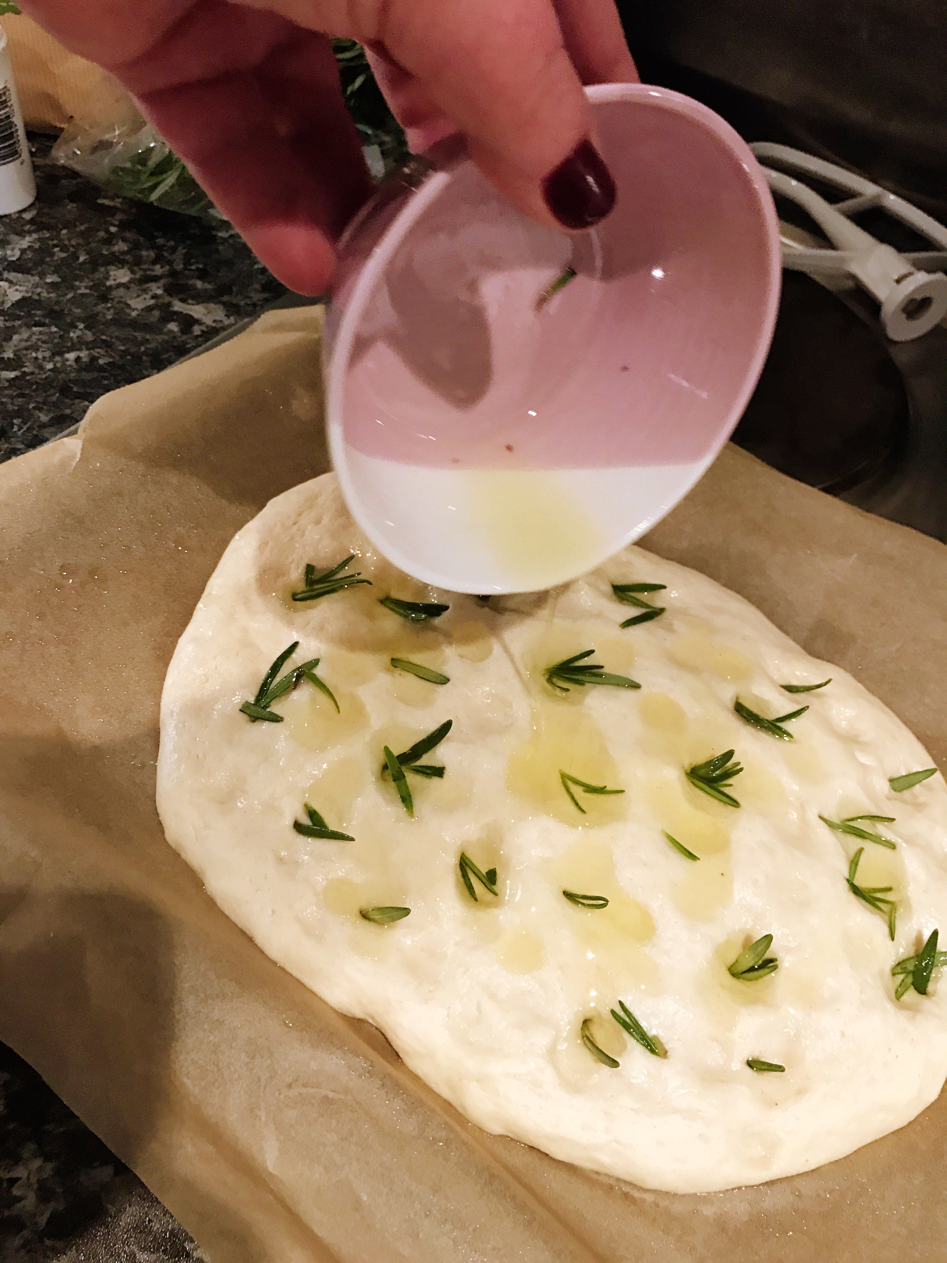 I have been planning to bake some Rosemary Focaccia for about 2 years now. Since the day my friend and housemate Phoebe came home from a long day of chef training at Leiths School of Food and Wine with the most delicious salty loaf of focaccia bread I have wanted to make an attempt at my own. That first slice was amazing and then when she told me that she didn’t want to eat any of it and I could enjoy the whole loaf… well I was in bread heaven. It lasted a day, maybe two at most.