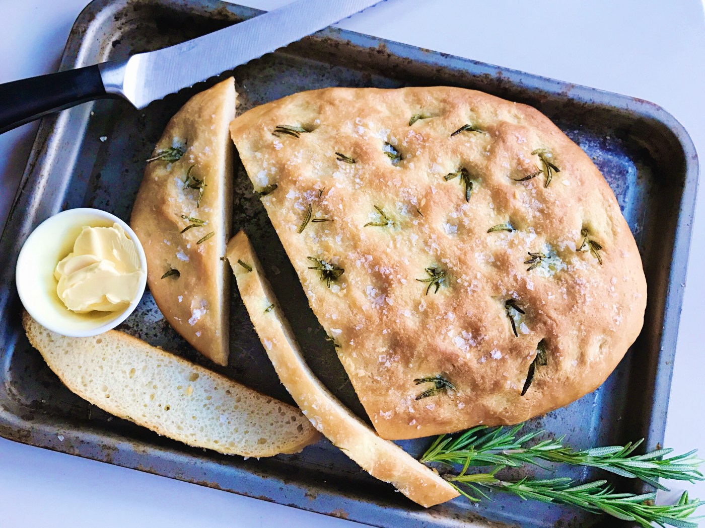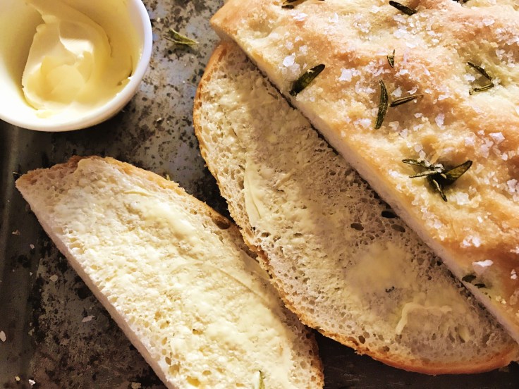 Other than that it was delicious and have already made my way through a fair amount of the loaf. It is yummy simply with a bit of butter, or you could add some Italian salami to make a little sandwich to take to work with you. My favourite bit was turning over the loaf and seeing the hidden green indented pattern that a sprig of rosemary had left underneath during baking. When I sent a pic over to Phoebe the feedback was it has “even air bubbles all the way through which shows it has been proved correctly – 5/5.” Sounds good to me!